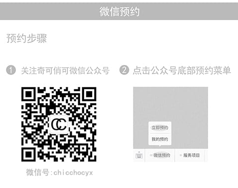 请关注“chicchoc奇可俏可”微信公众号进行预约微信号:chicchocyx